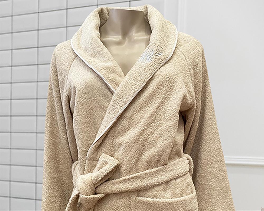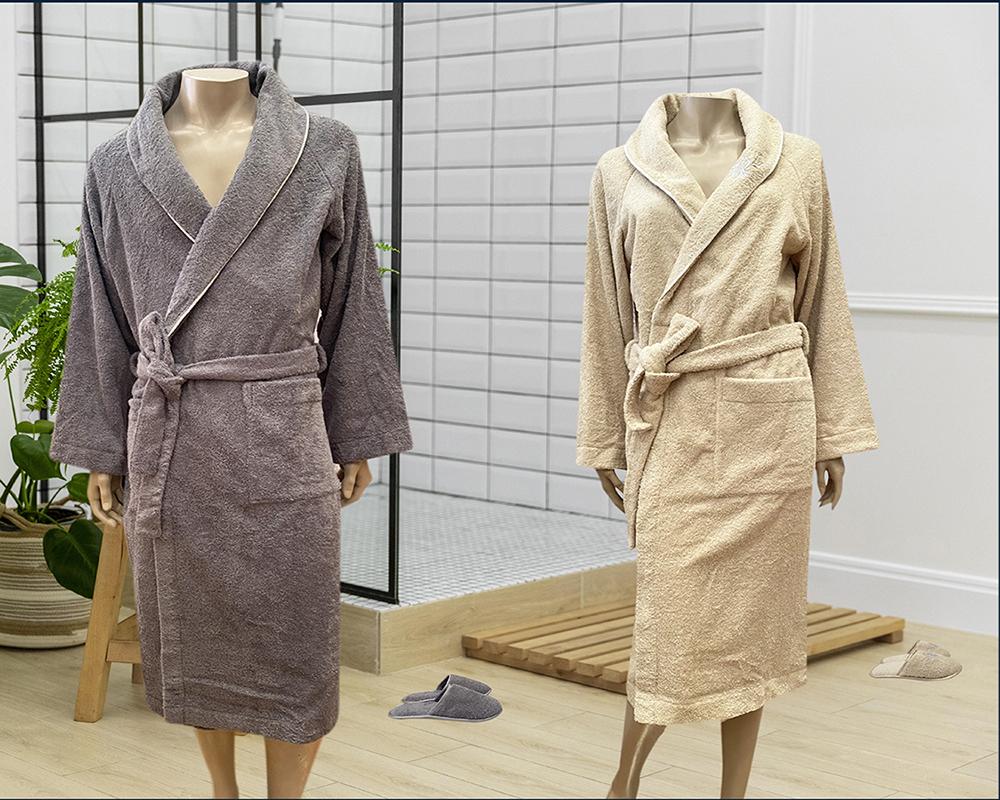 2 روب قطن 100%: روب للسيدات بلون بيج فاتح (مقاس L) وللرجال بلون رمادي (مقاس XL)، حيث يجمع بين الأناقة والراحة.