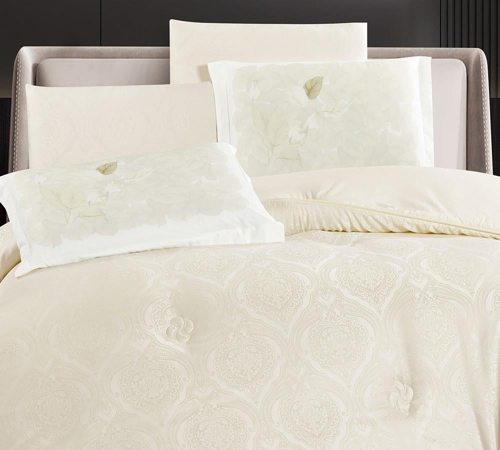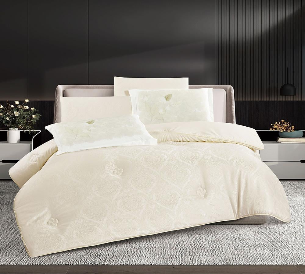 خامته الناعمة من ألياف البوليستر عالية الجودة تعانق بشرتك برفق، وخفته تمنحك راحة مثالية في ليالي الصيف. أما تصميمه الجاكار الأنيق، فيحاكي ذوقك الراقي ويجعل غرفتك لوحة من الفخامة والجمال تدوم معك طويلاً.